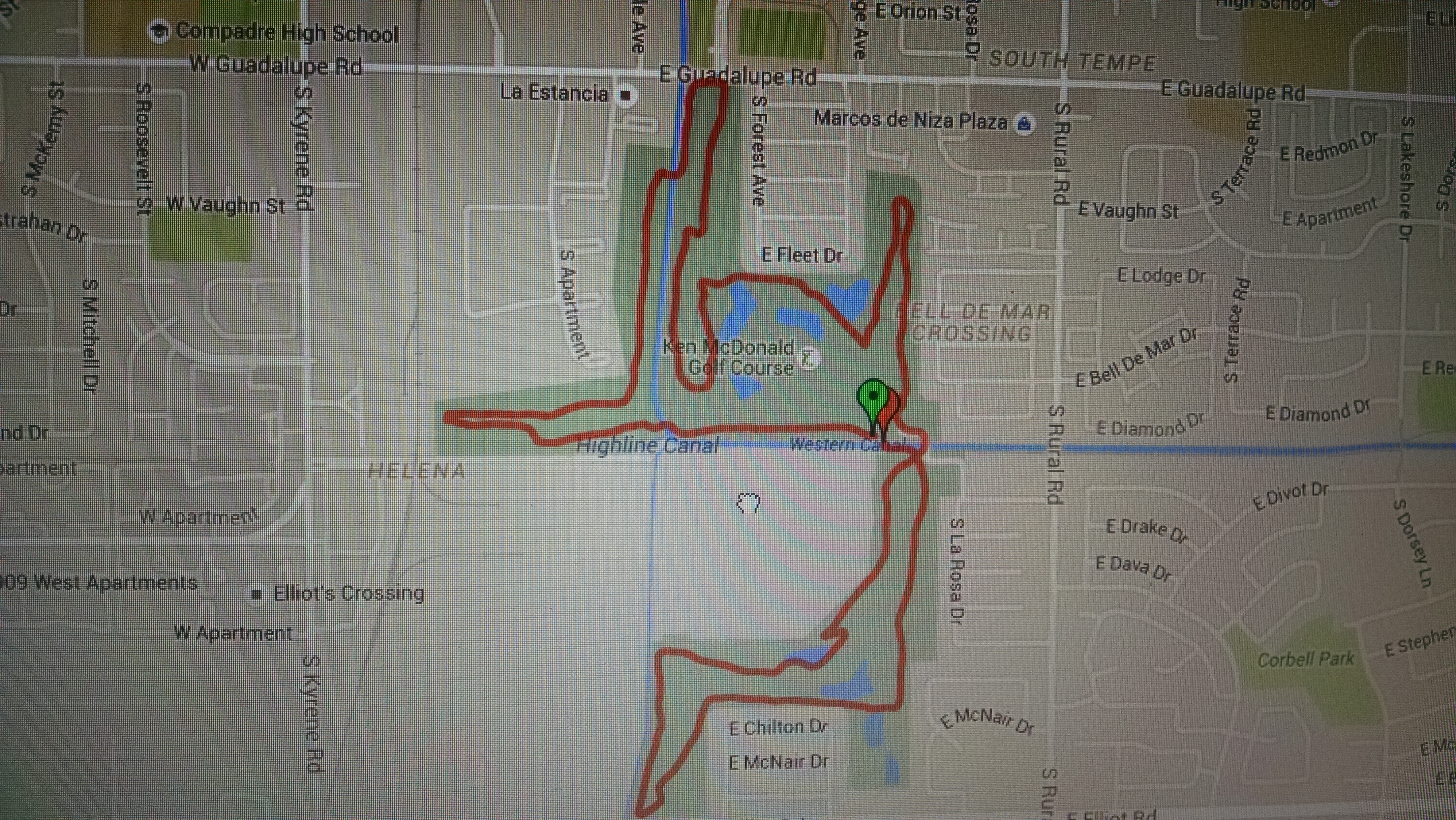 Below is a trace in and around the greens of Ken McDonald Golf Course in Tempe. The view in the video is taken in the morning at sunrise. My intention for depicting this circuit is to promulgate the vision I have for these one-dimensional properties as a multi-recreational greenscape, one that could be shared with Freerunners. This trace revealed a lovely 4.5 mile run that could be shortened or stretched however one sees fit. But, alas, for now, it will remain the domain of golf carts shuttling around groups of four or less every 15 minutes to poke a small white dimpled ball around a well-groomed yard.