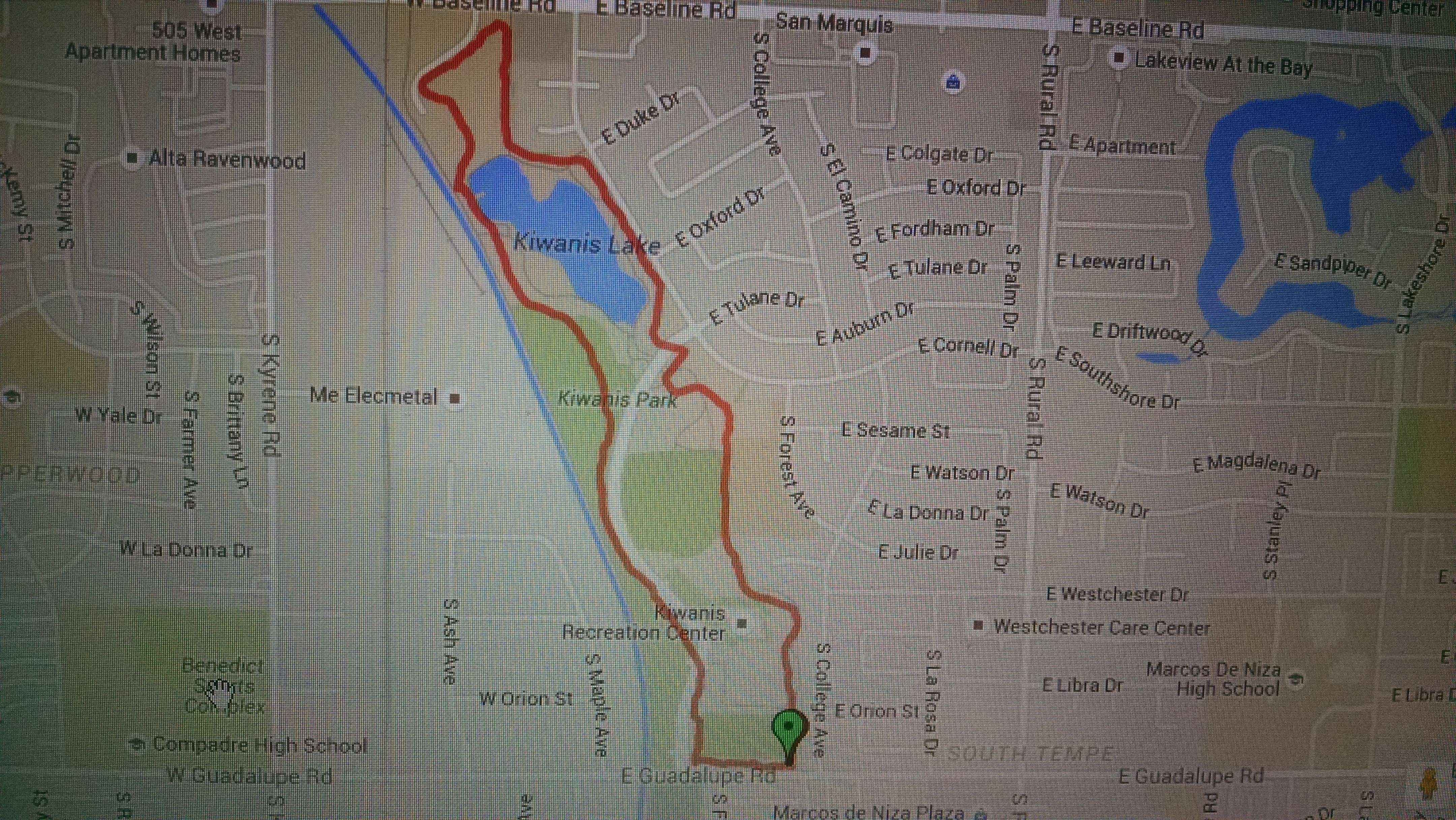 Here’s the Kiwanis Loop from the corner soccer field at College & Guadalupe to the top of the single field off Baseline, down along the canal and back to the origin. This circuit offers 2.6 miles of diverse scenery from ballfields and bridges to a man-made lake and canal path on its western border.